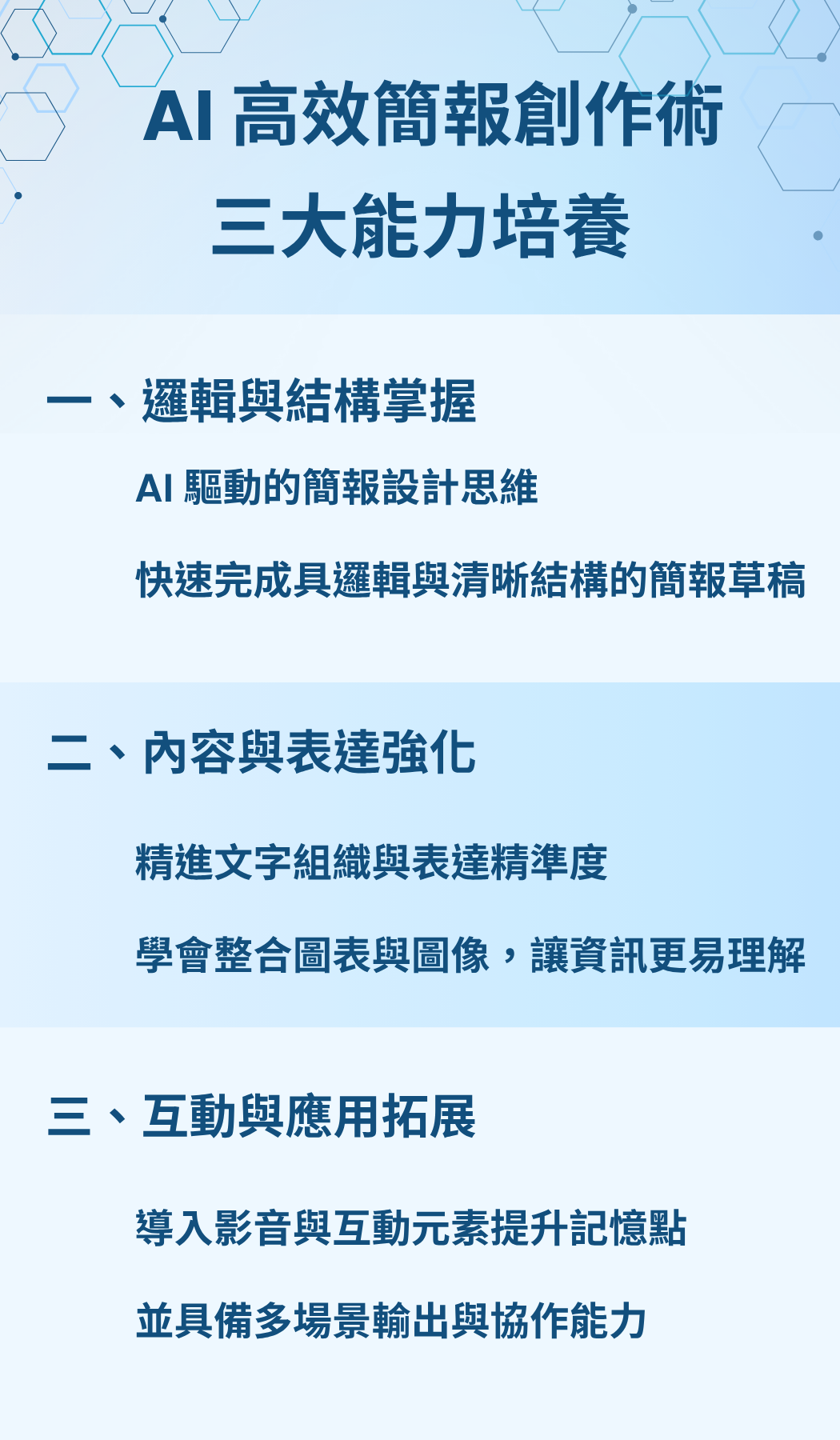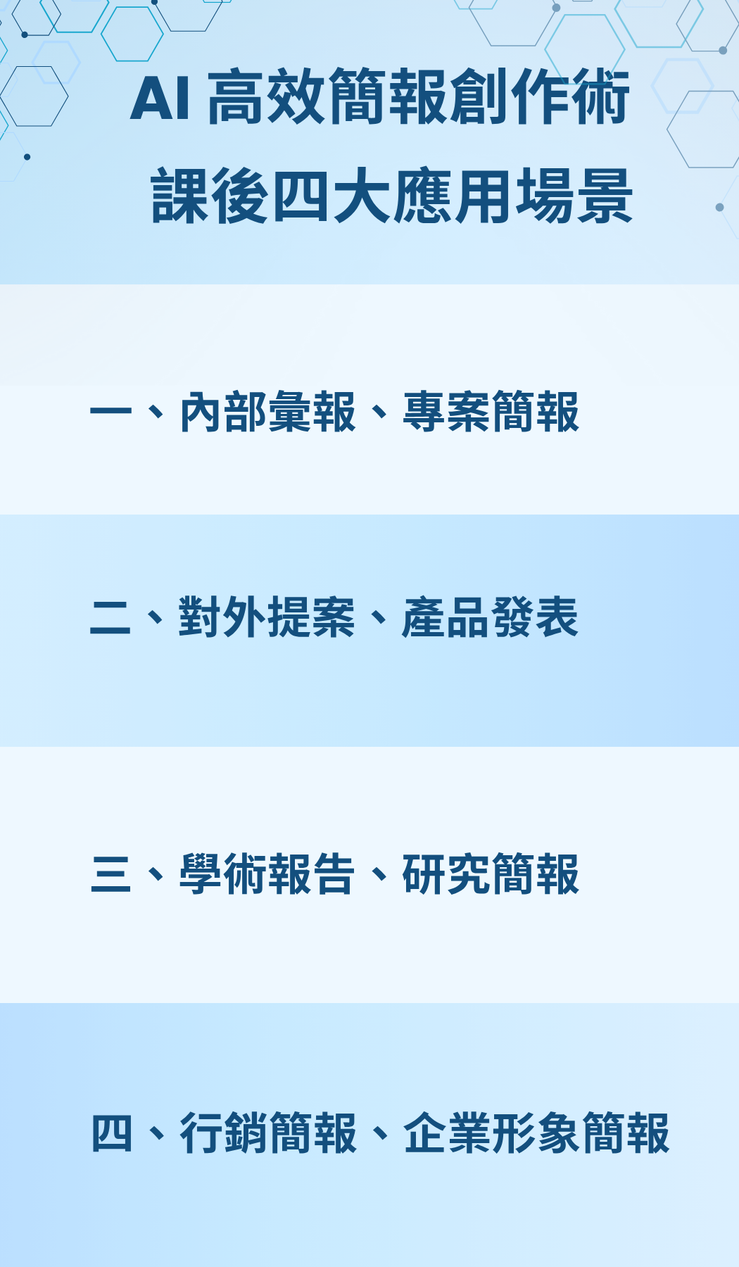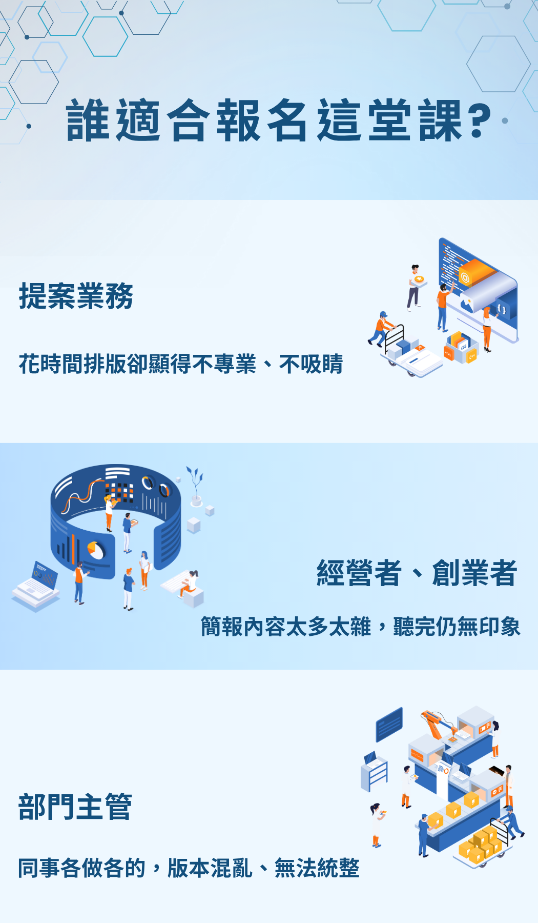 ✅ 強化視覺與影音表達力:結合圖表、影像與影音素材,提升說服力與吸引力。